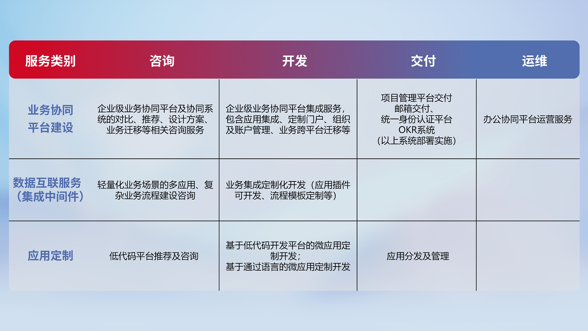 针对钉钉、、企微、、IDaas等平台级产品提供产品的规划、、方案、、、交付、、、、定制化开发等服务,,,实现如统一协同办公、、智能客户服务、、、、混合会议管理、、、智能数据查询、、等业务场景,,实现数字化转型。。